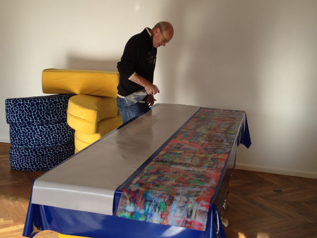 Herr Schaefer (Brückner & Neuner GmbH) bringt die Folien an